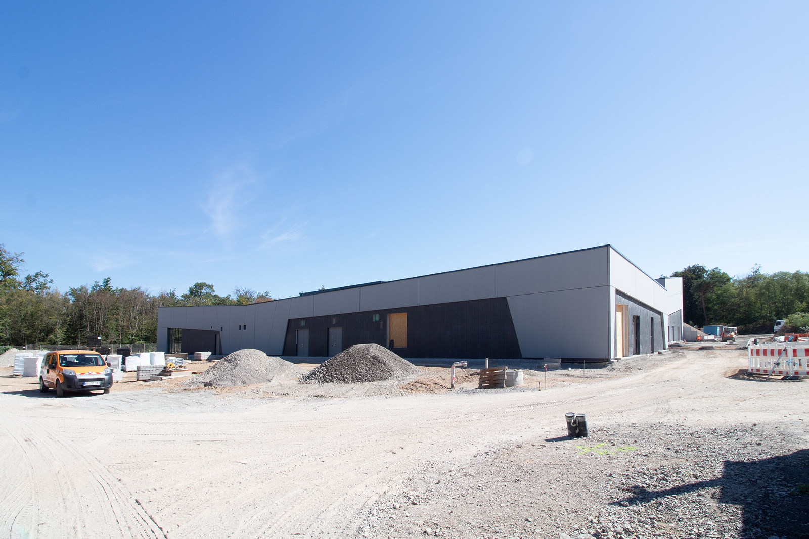 Bauzeit, nähern sich die Arbeiten an der Gebäudehülle seiner Vollendung. Die Fassade des neuen Wasserwerkes in Karlsruhe, bestehend aus Naturstein und Beton ist nun nach Rückbau des Baugerüstes erkennbar.