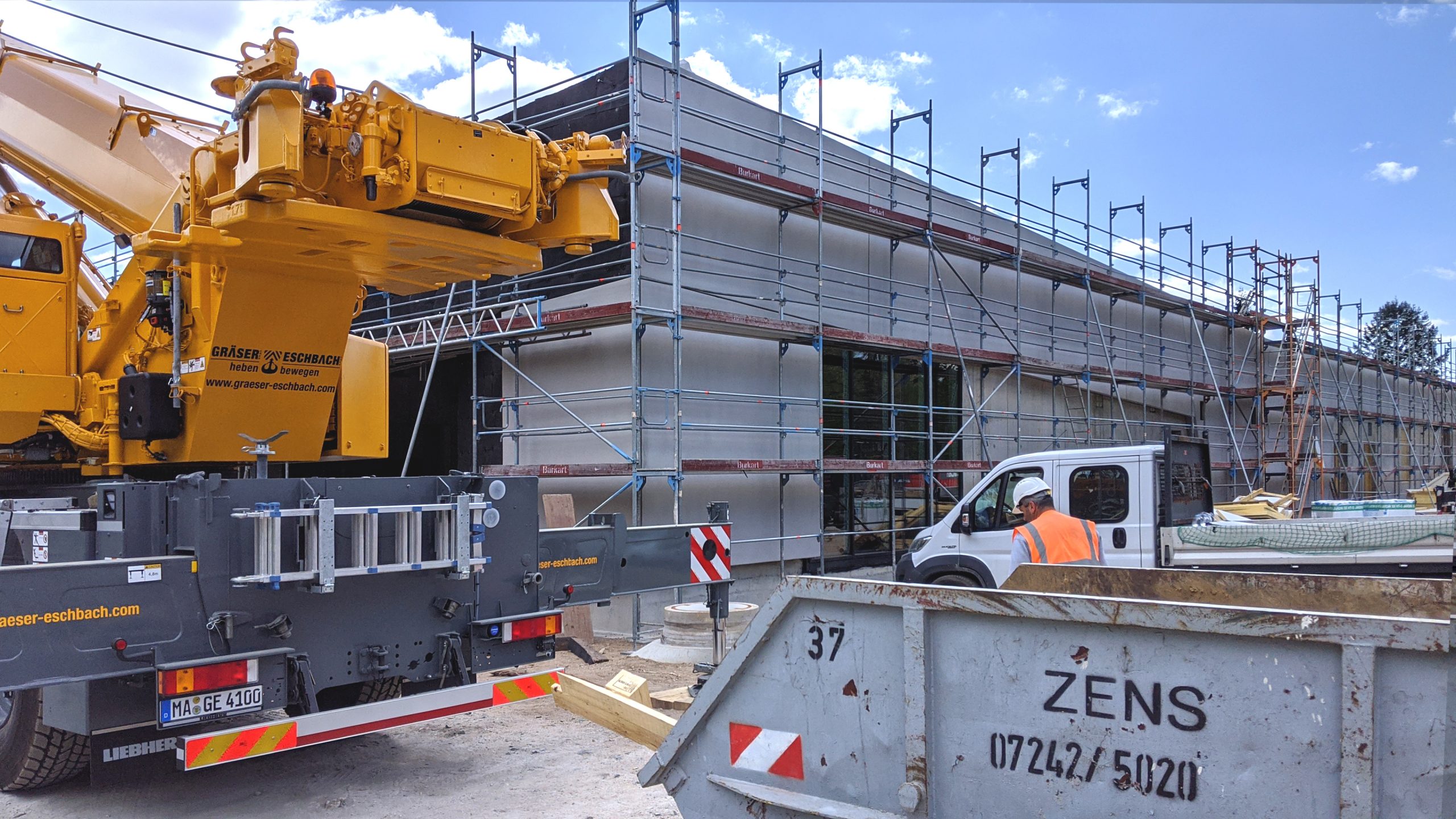Alle Arbeiten an der Gebäudehülle des Wasserwerkes schreiten voran. Bald wird die Montage der Fassadenelemente aus Beton und Metall beendet sein. Die Verlegung der Natursteinfassade ist in Vorbereitung und erfolgt etwa zeitgleich mit dem Aufbau der extensiven Dachbegrünung.